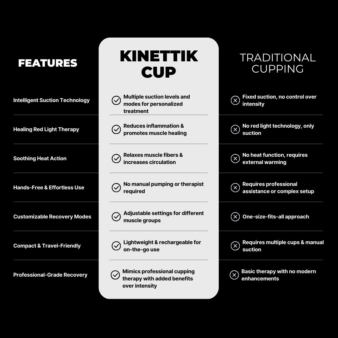 Unlock faster recovery with the KINETTIK Cup, a next-generation intelligent cupping therapy device designed to relieve muscle tension, improve circulation, and enhance performance. Combining negative pressure suction, red light therapy, and soothing heat, this compact, wireless recovery tool is perfect for athletes who push their limits and demand more out of every training session.
