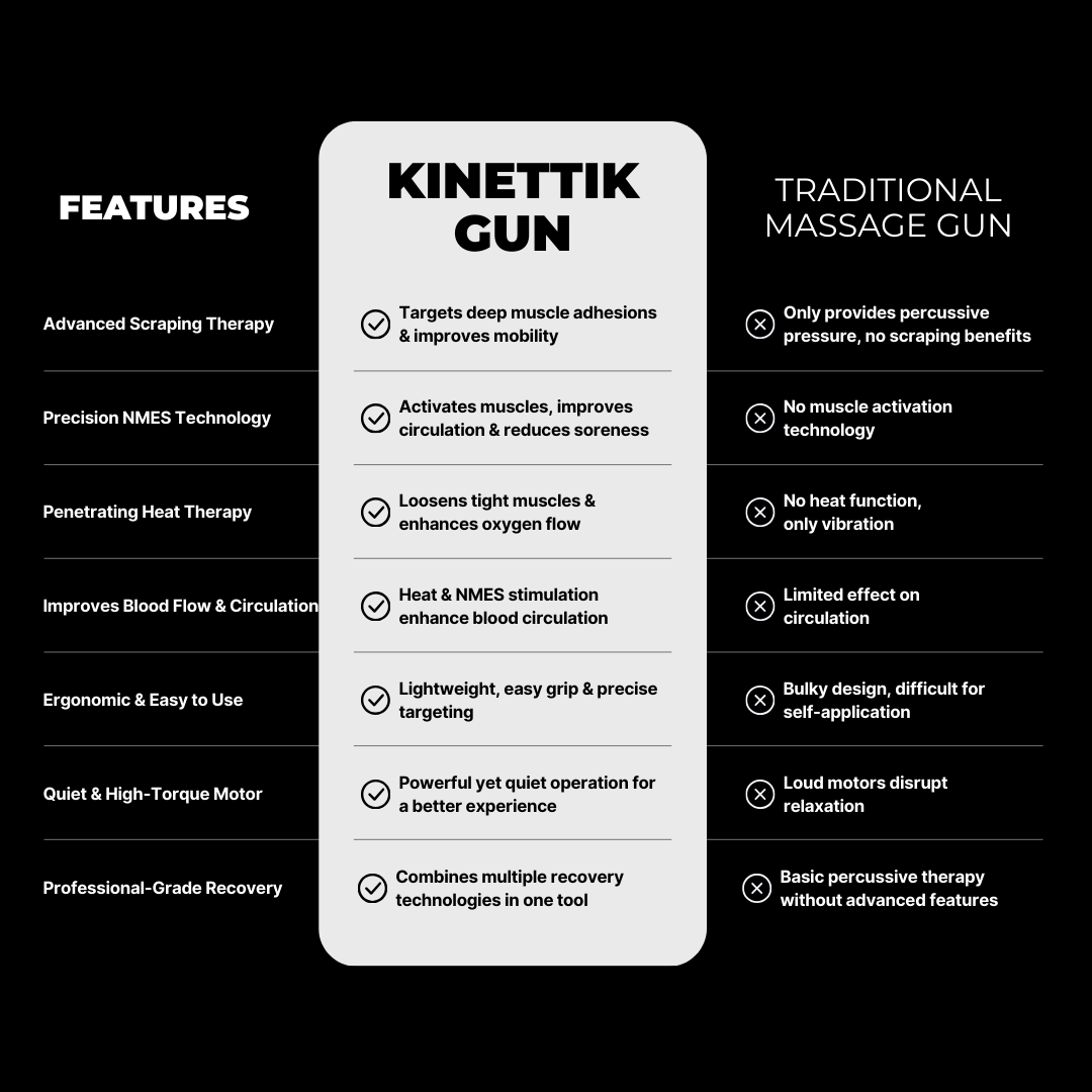 Experience deep muscle relief, faster recovery, and enhanced mobility with the KINETTIK Gun. Featuring precision scraping, NMES technology, and heat therapy, this athlete-engineered tool is designed to break through stiffness, boost circulation, and keep you performing at your peak.