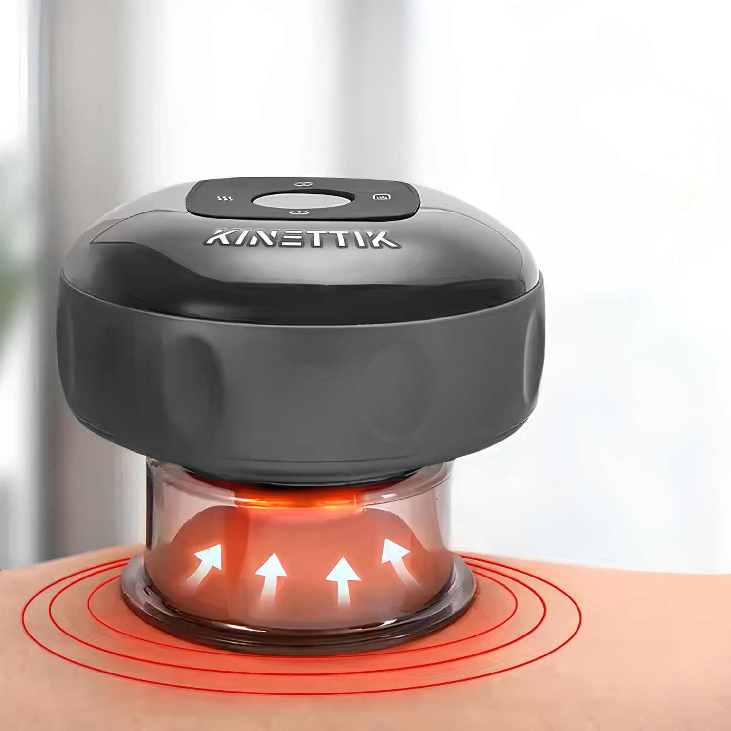 The KINETTIK Cup is an advanced smart cupping therapy device that combines negative pressure suction, red light therapy, and heat therapy to enhance muscle recovery. It works by creating controlled suction to improve blood circulation, reduce muscle tightness, and promote deep tissue healing.